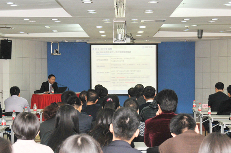 張總裁在會(huì)議上做了2014年年度工作報(bào)告及2015年工作安排,全面客觀地回顧了一年來公司各項(xiàng)工作進(jìn)展情況,發(fā)現(xiàn)問題,總結(jié)得失,并根據(jù)戰(zhàn)略規(guī)劃部署了新一年重點(diǎn)工作任務(wù)。2014年是公司進(jìn)行戰(zhàn)略轉(zhuǎn)型的第一年,在“抓住機(jī)遇、提質(zhì)增效”的指導(dǎo)思想下,圍繞抓好融資結(jié)構(gòu)升級和風(fēng)控手段創(chuàng)新兩個(gè)著力點(diǎn),加快干部隊(duì)伍建設(shè)梯隊(duì)化和年輕化步伐,構(gòu)建了“業(yè)務(wù)行業(yè)化、融資多元化、風(fēng)控專業(yè)化”的經(jīng)營新格局。