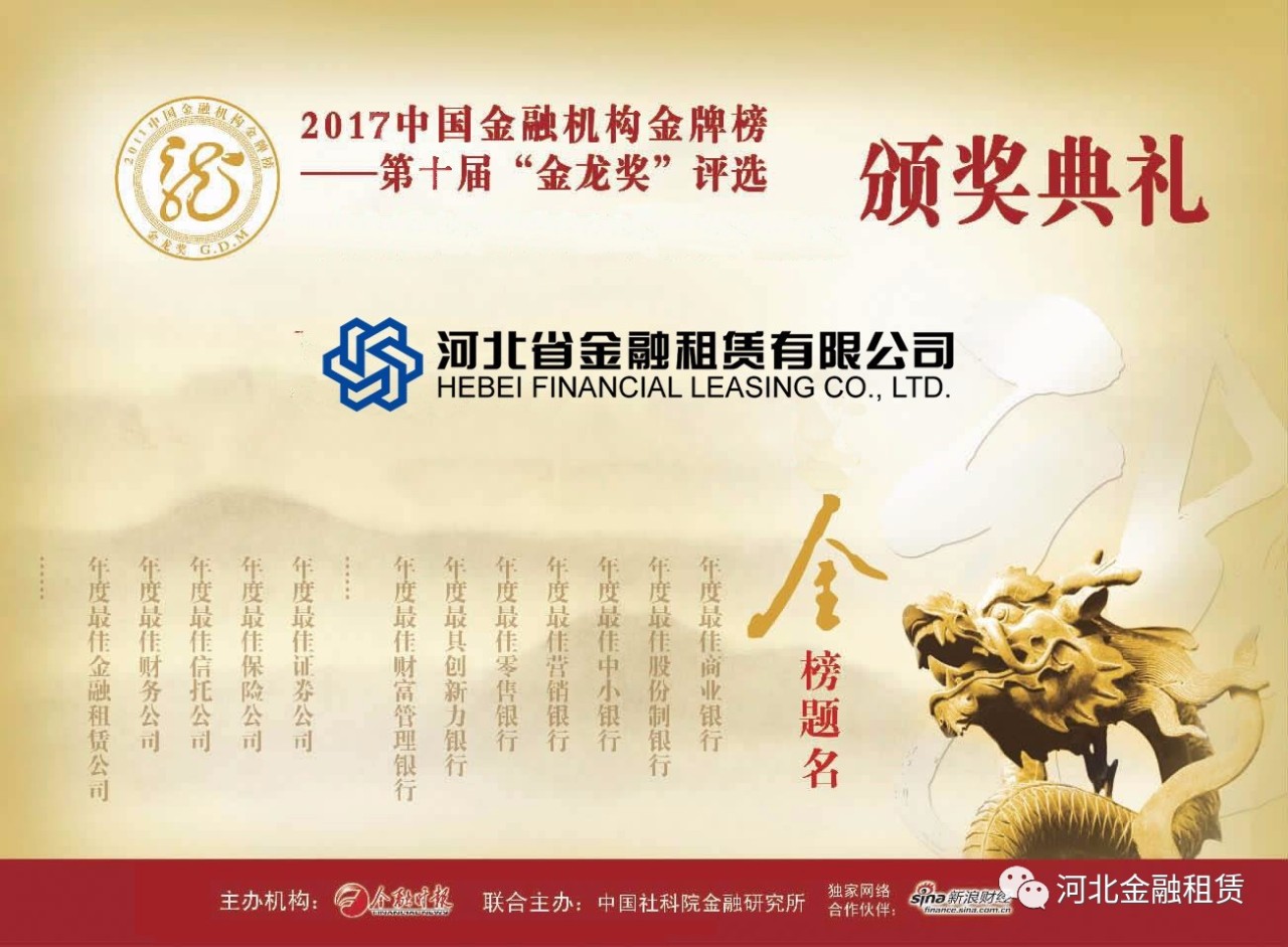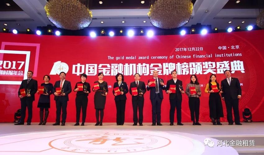 近日,《金融時報》2017年會暨中國金融機構金牌榜頒獎盛典在京舉行,此次頒獎盛典中,河北省金融租賃有限公司(以下簡稱河北金租)榮膺最具創新力租賃公司獎項。