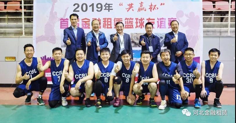 河北金租總裁王永生(后排左五)、建信金租副總裁徐大公(后排左四)、中鐵金控租賃公司副總經理周光明(后排右四)、河北金租副總裁李永德(后排左三)、河北金租工會主席石拴江(后排右三)等與河北金租籃球隊。