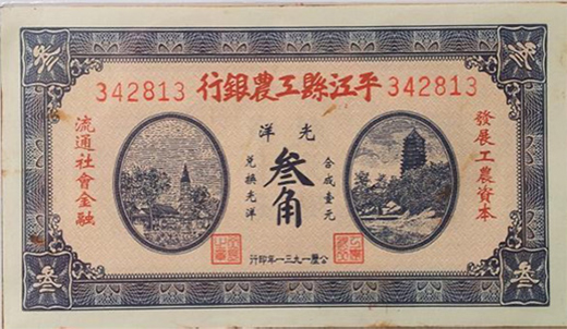 中央蘇區(qū)的紅色政權(quán)成立之后,國民黨在進(jìn)行反革命軍事“圍剿”的同時,還采取了嚴(yán)密的經(jīng)濟(jì)封鎖切斷了當(dāng)時閩西蘇區(qū)與外界的聯(lián)系,給當(dāng)時閩西經(jīng)濟(jì)制造了嚴(yán)重的困難。為了打破國民黨的經(jīng)濟(jì)封鎖,閩西蘇區(qū)政府通過公營商業(yè)、合作社商業(yè)、私營商業(yè)推動商品流通來發(fā)展經(jīng)濟(jì)。當(dāng)時在閩西蘇區(qū),不僅有國民政府的中央銀行、中國銀行、交通銀行、農(nóng)民銀行四行紙幣,還有軍閥張貞發(fā)行的“民興”鈔、資本家徐名鴻發(fā)行的“閩西農(nóng)民”鈔,同時還有大量雜洋等劣質(zhì)銀幣充斥市場,且銀價極不統(tǒng)一,金融市場非常混亂。為了蘇區(qū)人民經(jīng)濟(jì)生活的穩(wěn)定和工農(nóng)業(yè)生產(chǎn)的發(fā)展,1927年12月,福建上杭縣蛟洋農(nóng)民協(xié)會建立了福建省第一個紅色金融機(jī)構(gòu)——蛟洋農(nóng)民銀行,行址設(shè)于蛟洋村的“義合祠”。創(chuàng)辦時資本金僅有2000元大洋,工作人員3人。農(nóng)民銀行成立后,隨即發(fā)行流通券4000元,面值有1元和3角兩種,主要在上杭蛟洋,龍巖的大池、小池,以及連城的廟前、莒溪一帶流通。蛟洋農(nóng)民銀行規(guī)定,流通券以銀元為本位幣,可以隨時兌換,可以在農(nóng)民銀行興辦的商店內(nèi)購買各種生活必需品;家庭貧困者,可以在農(nóng)民銀行借款,借款5元以下不計利息。